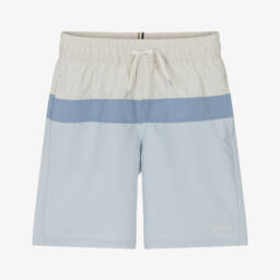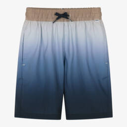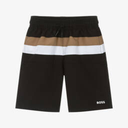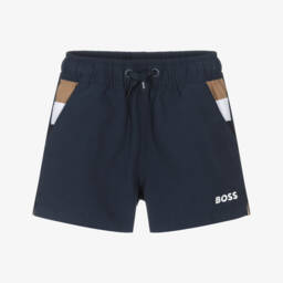 Mini-me swim shorts for boys by BOSS, made in soft, lightweight fabric in a beige colourway. These mesh-lined shorts have a comfortable elasticated waist with decorative drawstring ties. They have neat side pockets and a bold logo print on one leg for a branded look.