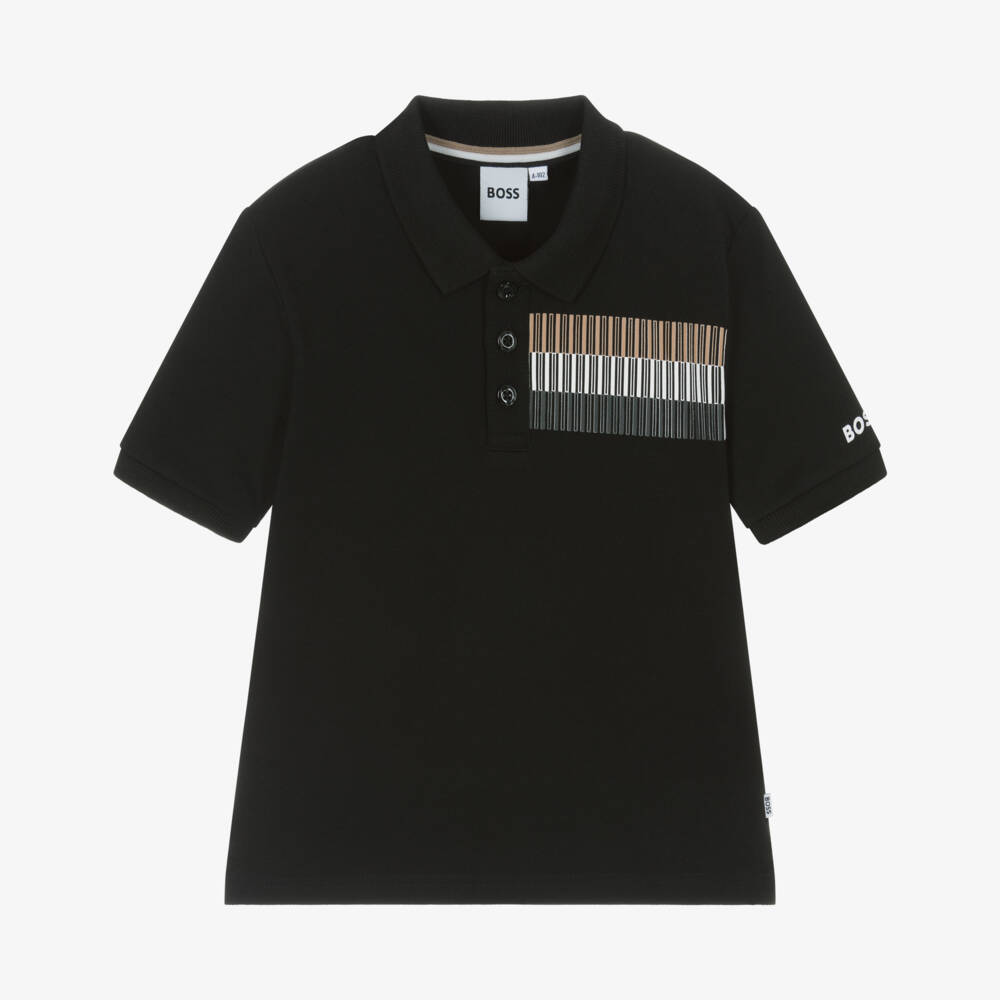 A black cotton piqué polo shirt for boys from BOSS. The brand's signature tri-colour striped detailing is printed on the chest and a logo print on the arm ensures instant brand recognition.