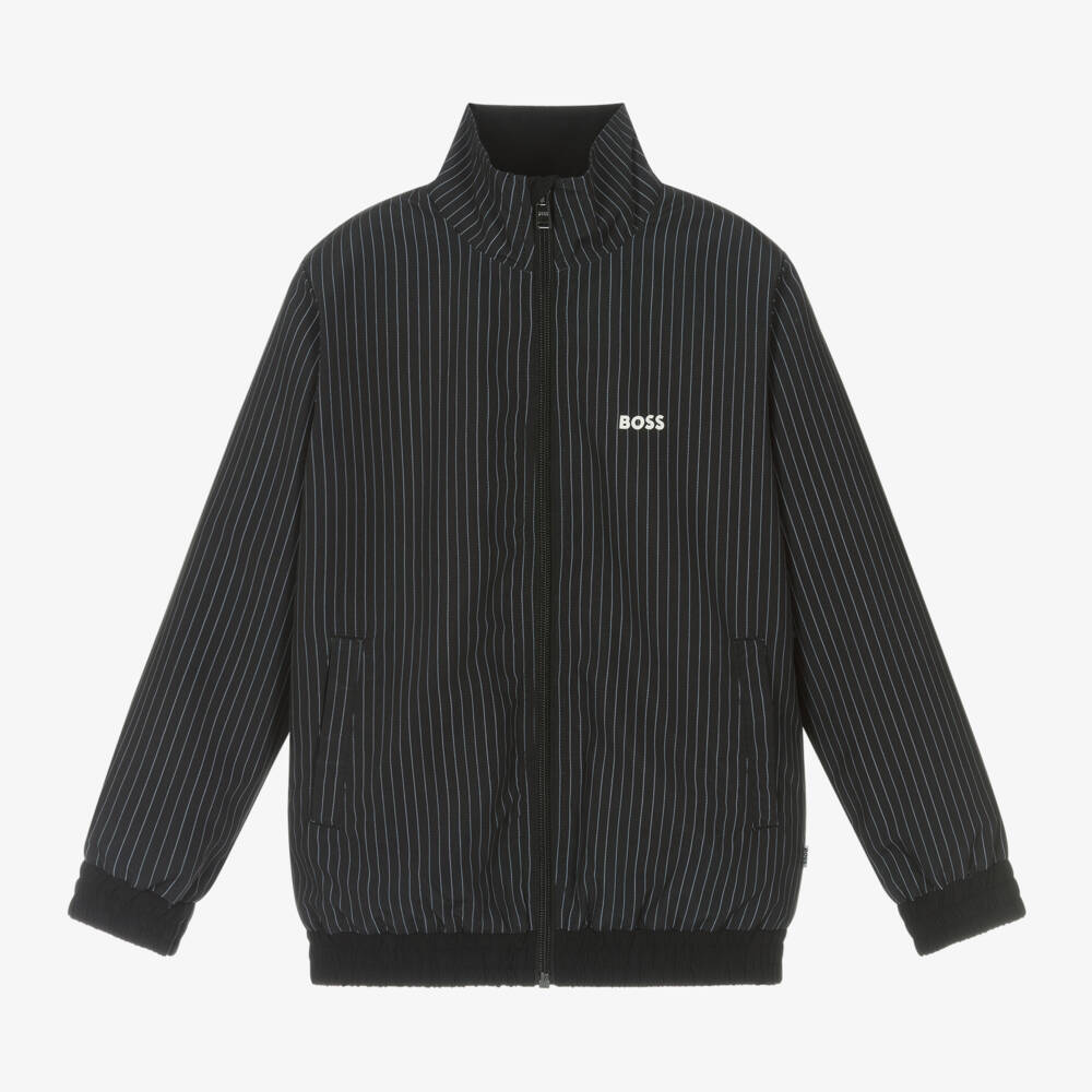 A stylish, lightweight Mini-me zip-up jacket for boys by BOSS, in a black and white pinstripe design. Silky smooth with a comfortable mesh lining, it has a stand-up collar, elasticated trims and useful front pockets. A white logo print on the chest, branded side seam tab and zip pull add a distinctive designer touch.