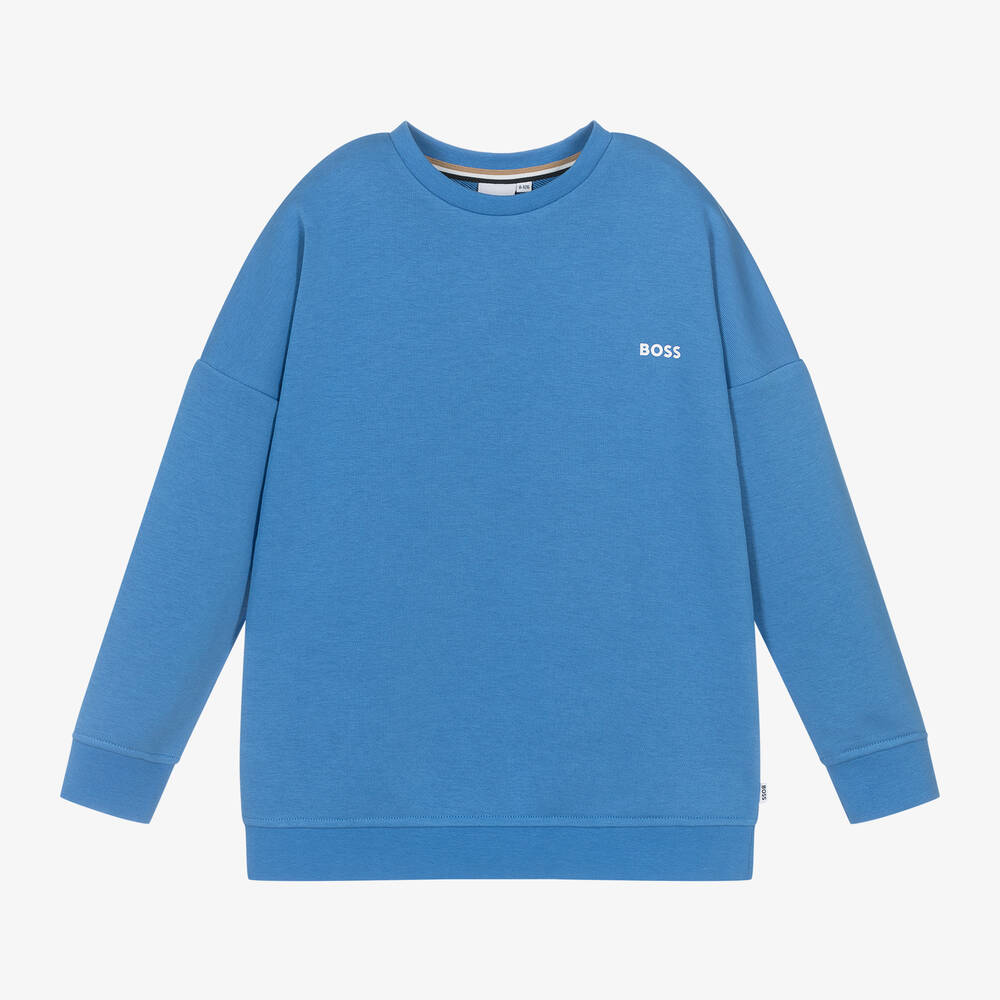 A blue sweatshirt for boys from BOSS, with a small white logo on the chest. Made in soft cotton blend jersey, this casual top is styled with dropped shoulders for a laid-back look.