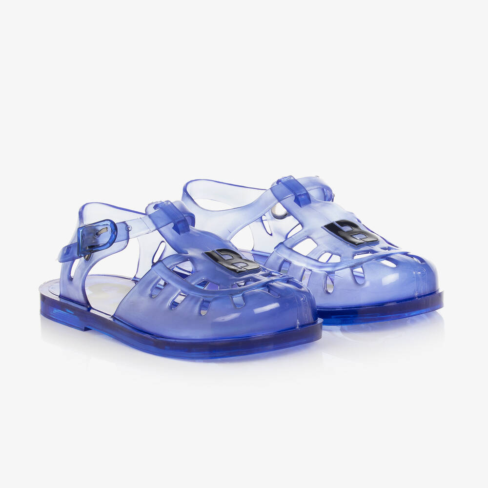 Transparent blue jelly sandals for boys by BOSS, with logo branding on the toes and inner soles. Keeping little feet protected, these T-bar shoes fasten easily with an adjustable buckle strap on the ankle for a secure and comfortable fit. Shell-shaped treads decorate the outer sole for added grip.
