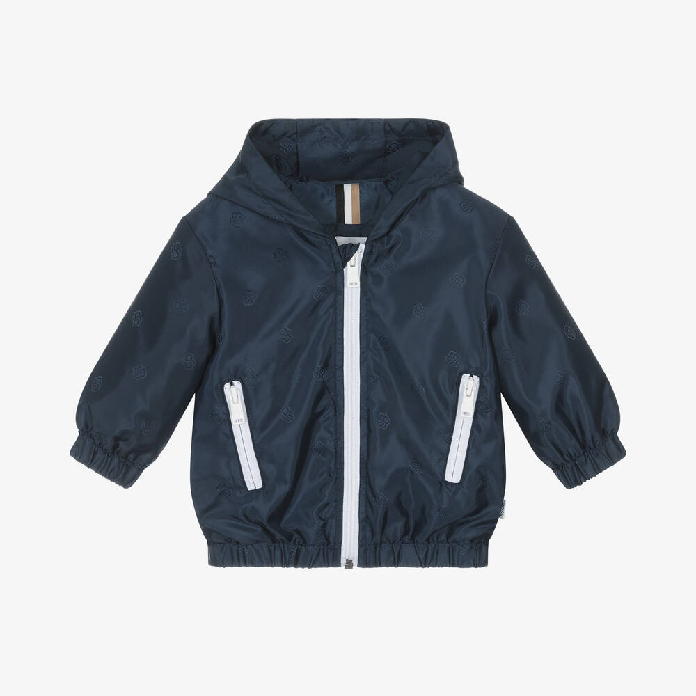 A navy blue hooded jacket for little boys by BOSS, with a tonal Double B monogram jacquard pattern. Silky and lightweight with a full lining, this windbreaker features a water-repellent finish, elasticated trims and contrasting white zip fastenings on the front and pockets.