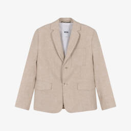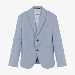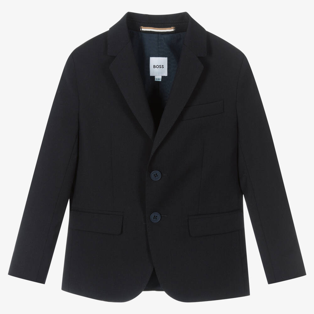 Smart special occasion jacket for boys by BOSS. Made in luxurious lightweight wool with a slight stretch, it is slightly fitted with a single back vent, and stylish stitched trims. It has a chest pocket, two front pockets and a useful internal pocket. A logo-patterned satin jacquard lining and branded button fastenings give a discreet designer finish.
