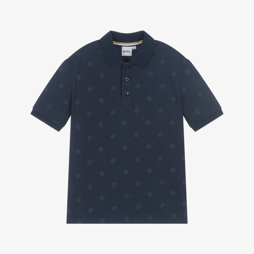 A navy blue Mini-me polo shirt for boys by BOSS, patterned with the brand's Double B monogram. It is made in soft and breathable cotton piqué and styled with short sleeves and front button fastenings.