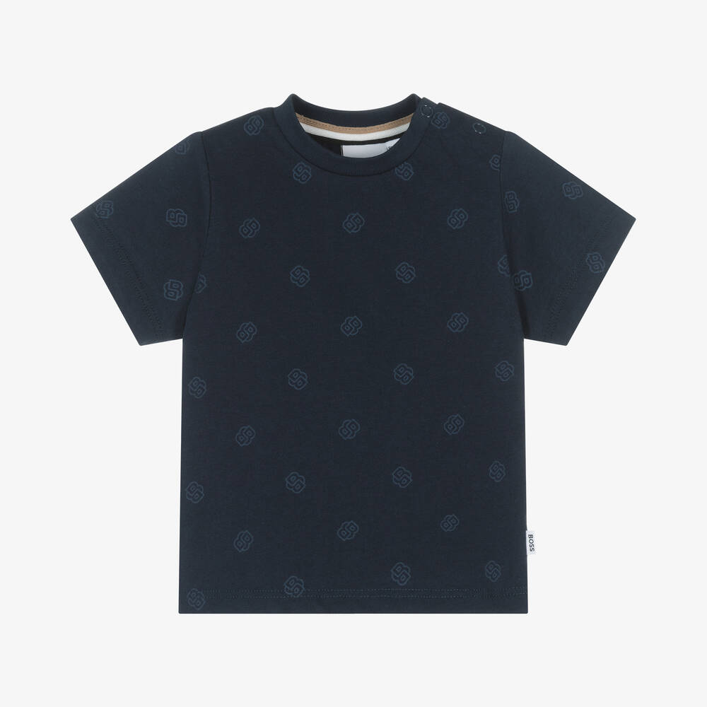 Navy blue cotton T-shirt for little boys by BOSS, with a tonal Double B monogram pattern. Soft and stretchy for comfortable wear, this short-sleeved tee has shoulder popper fastenings to help with dressing.