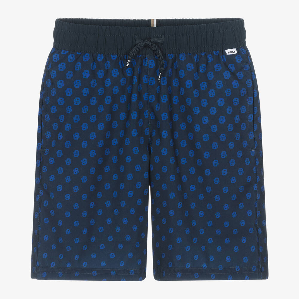 A stylish staple for a cool resort look, these Mini-me navy blue swim shorts for boys are by BOSS. Soft and smooth, they have a Double B monogram pattern in bright blue, branded drawstring tips and striped signature trims for a complete designer vibe. They have a soft mesh lining for extra comfort and neat side seam pockets.