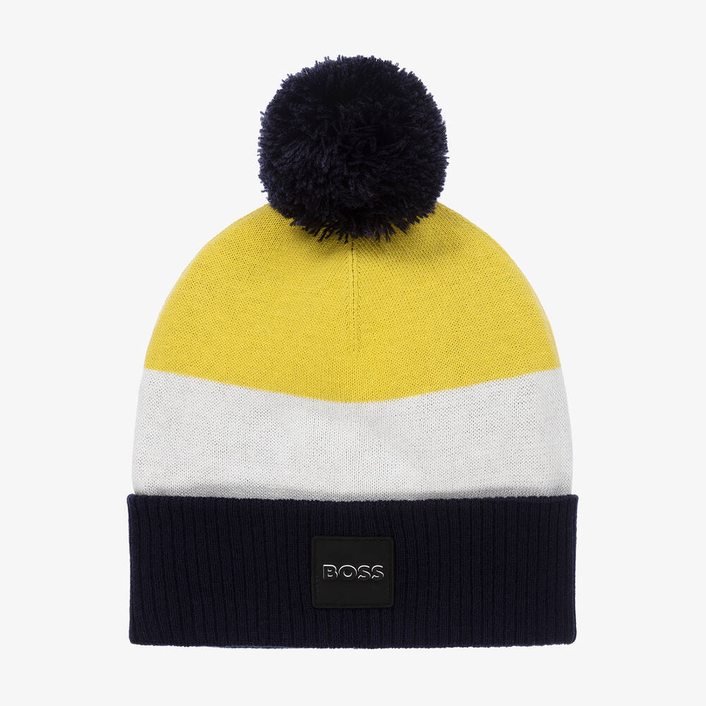 Navy blue, white and yellow striped beanie for boys, by BOSS. Knitted in super soft cotton, it has a cute bobble on the top and a matte black rubberised logo on the turned-up brim.