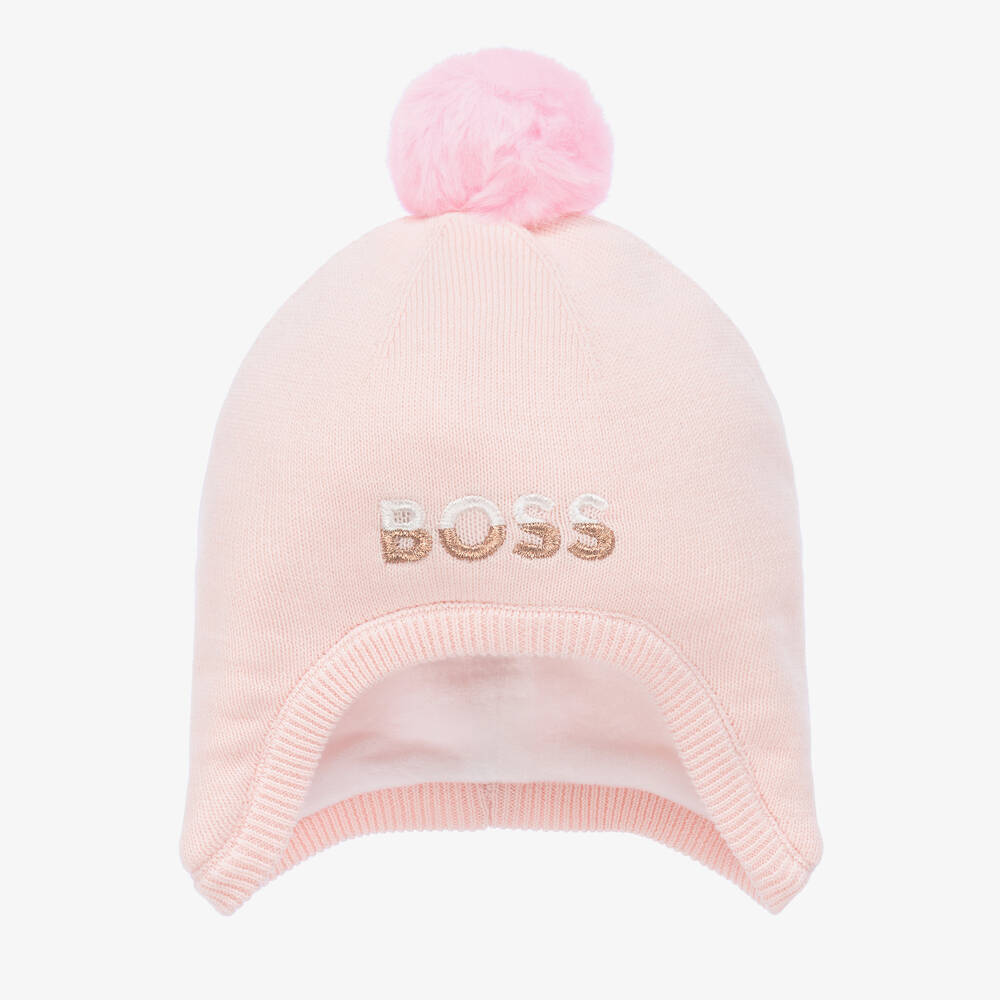 Gorgeous pale pink hat for little girls by BOSS. Finely knitted in soft cotton, it is lined in super soft plush velour to help keep little ones warm on chilly days. There are comfortable ribbed trims and cosy ear flaps for extra warmth, with a cute pink pom-pom on the top. The brand's signature logo is embroidered on the front in white and rose gold for a sweet branded finish.