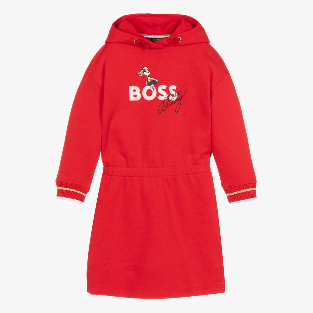 A hooded sweatshirt dress for girls by BOSS, printed with an iconic Lola Bunny rabbit above the velvet logo. Made in soft cotton jersey with a looped underside, it has decorative drawstring details, an elasticated waistband and ribbed trims with glittery gold stripes.