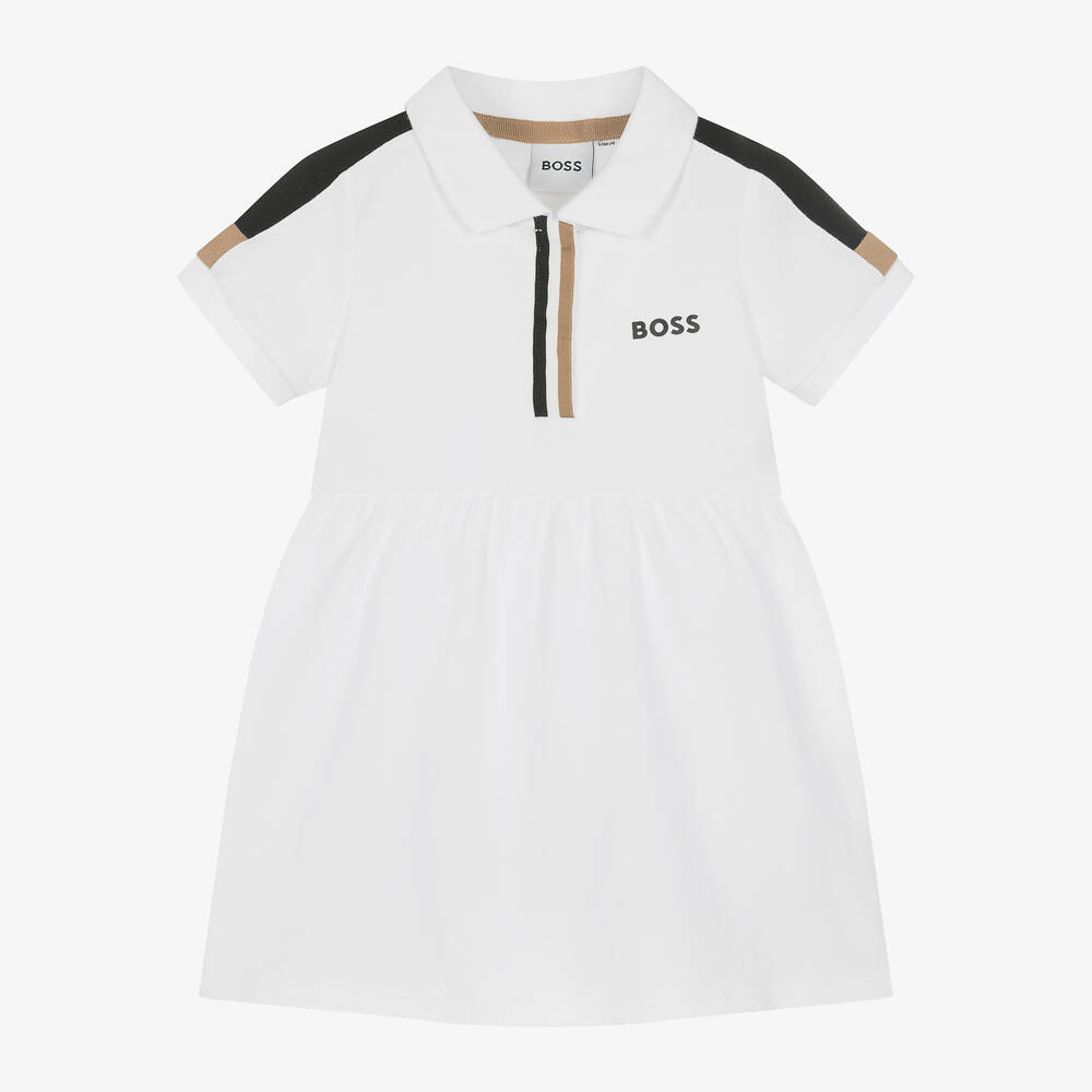 Sporty and sweet, this white polo shirt dress for little girls is by BOSS. Made from soft cotton piqué, there is a black rubberised logo on the chest for a branded look. Cool and casual, it has a ribbed collar and cuffs, black and beige trims on the shoulders, and signature striped detailing over the concealed popper fastenings on the front.