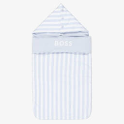From BOSS, a pale blue cotton nest to keep baby boys and girls warm and comfortable. Made in soft jersey and lightly padded for warmth, it is printed with the brand's instantly recognisable Double B monogram. There is a zip along the side and bottom for ease of use and the hood unfastens with poppers, allowing it to lay flat.