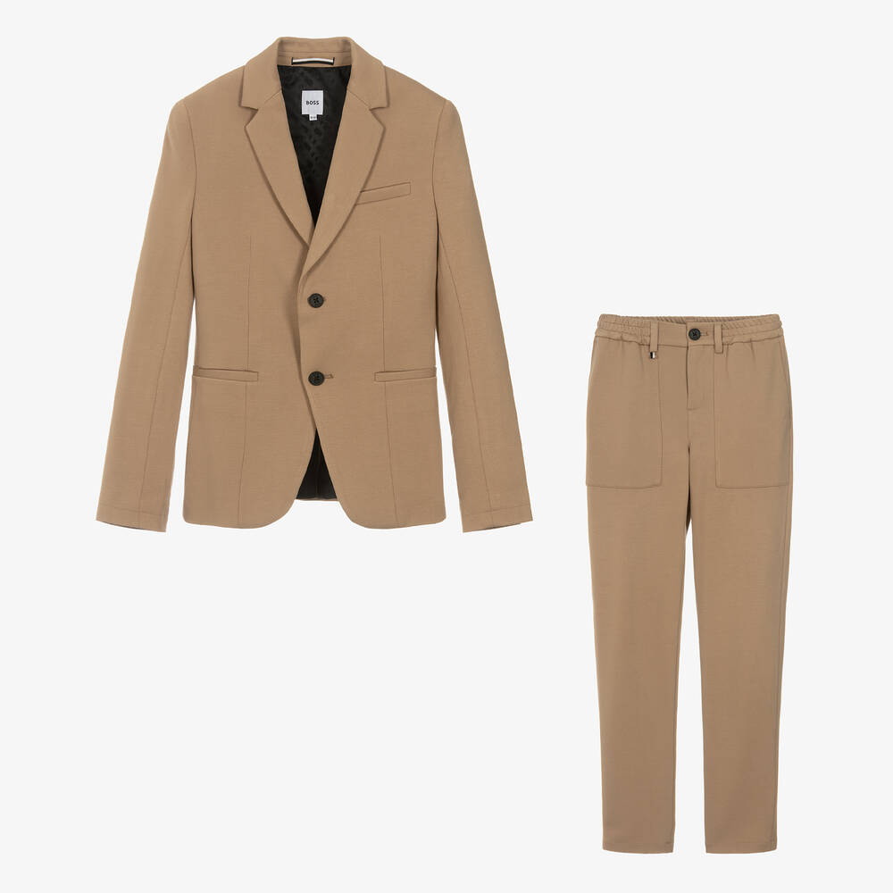 Both stylish and smart, a beige suit for teen boys by cool German designer BOSS, ideal for special occasions. Super comfortable, it is slightly fitted and made in soft, lightweight Milano jersey with black logo button fastenings. The jacket has front pockets, with a useful, button-fastening chest pocket on the inside and a black satin lining for comfort. The trousers have a casual vibe, with an elasticated waistband, large front patch pockets and more pockets around the back. They fasten with a button and zip on the front and have the brand's tri-colour logo tab below one of the belt loops.