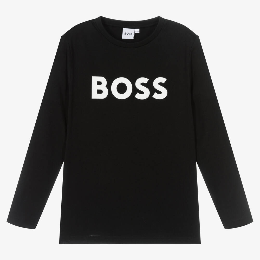 Black top for teen boys by BOSS, with a bold white logo print on the front. Cool and comfortable, this casual top is made in soft cotton jersey. Ideal for every day wear and great for layering, it has a classic ribbed crew neck.