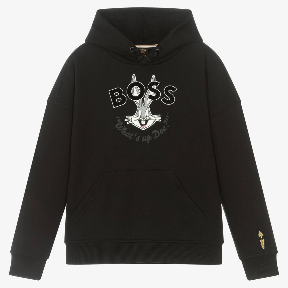A black hoodie for teen boys by BOSS, made in soft sweatshirt jersey, with a looped underside. Forming part of the Looney Tunes™ x BOSS capsule collection, the front has a white and grey Bugs Bunny rabbit logo print with an iconic 'What's up Doc?' slogan, and a gold carrot embroidered on one sleeve. There are decorative drawstrings on the hood, a front pouch pocket and ribbed trims.