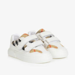 Beige Vintage check trainers for baby boys and girls, by luxury British brand Burberry. They have white leather trims and a double velcro-fastening leather straps. Made in soft cotton canvas, they have soft leather lining and insole. The ridged, non-slip white rubber outsole has a Burberry logo embossed on the back.