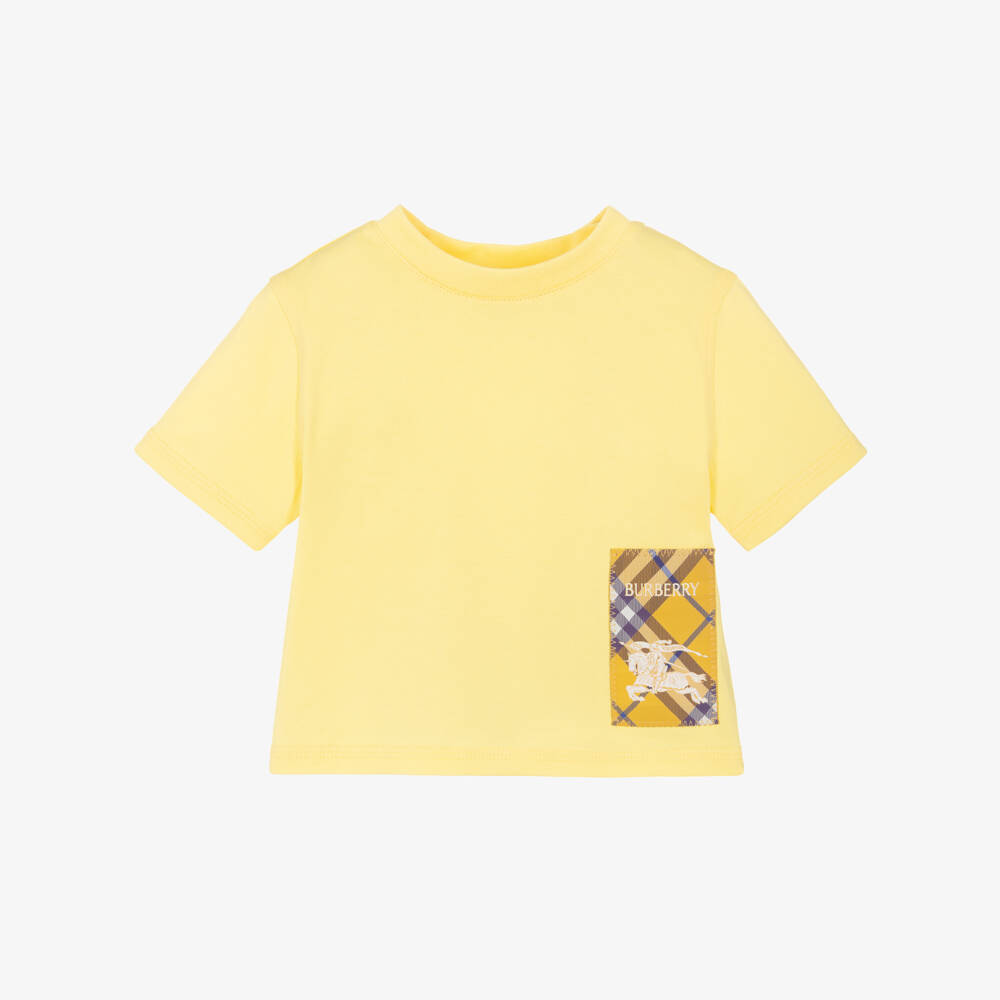 Yellow T-shirt for baby boys by luxury British brand Burberry, made in soft cotton jersey. This casual, short-sleeved tee features a Burberry Check patch on the front printed with the designer's signature Equestrian Knight Device. It fastens with poppers on one shoulder to help with dressing.