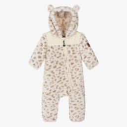 A beige fleece pramsuit for baby boys and girls, by luxury designer Burberry. Patterned with the Burberry Check, this hooded style is comfortably lined and fastens with a B-cut zip pull on the front. Smaller sizes are designed with integrated scratch mitts and booties for extra cosiness.