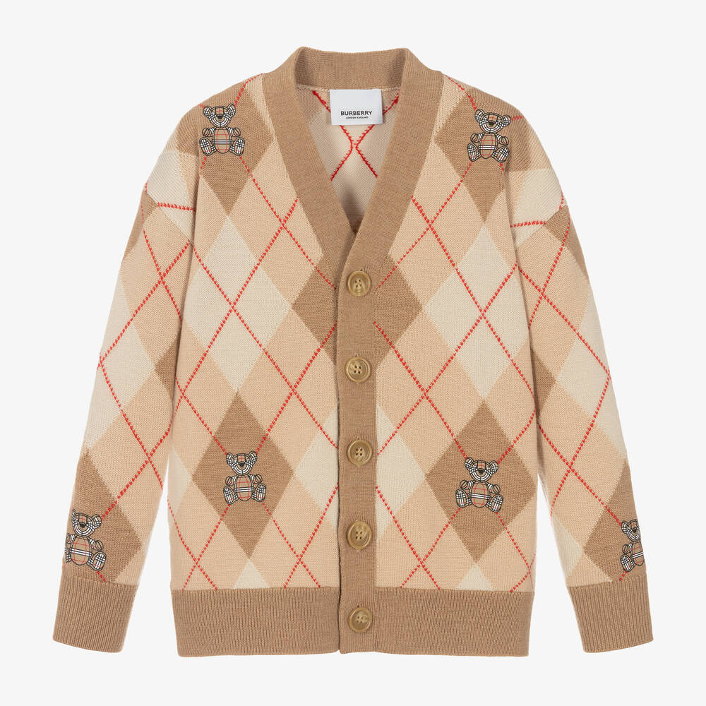 Beige cardigan for boys and girls by luxury British brand Burberry, knitted in luxuriously soft Merino wool. Cosy and warm, this lovely cardigan is designed with an argyle pattern, featuring Thomas Bear motifs for a distinctive designer look. Classically styled with a smart V-neckline, it has cosy ribbed trims and fastens on the front with buttons.