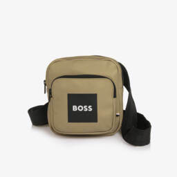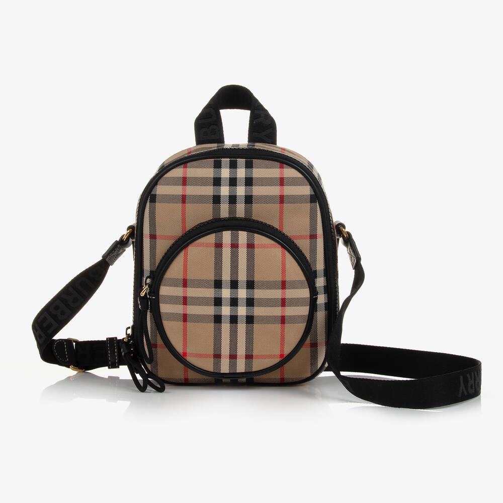 Beige crossbody bag for boys and girls by luxury British brand Burberry. Made in sturdy cotton canvas, it is patterned with the Burberry Vintage Check, the label's iconic house code, in black, beige and red, and trimmed in black leather. There is a circular, zipped pocket on the front and a branded slip pocket on the inside compartment, which also fastens with a zip and is lined in silky satin. The bag has a black, adjustable shoulder strap with jacquard logos and gold hardwear, as well as a coordinating carry handle on top.