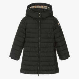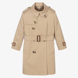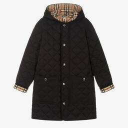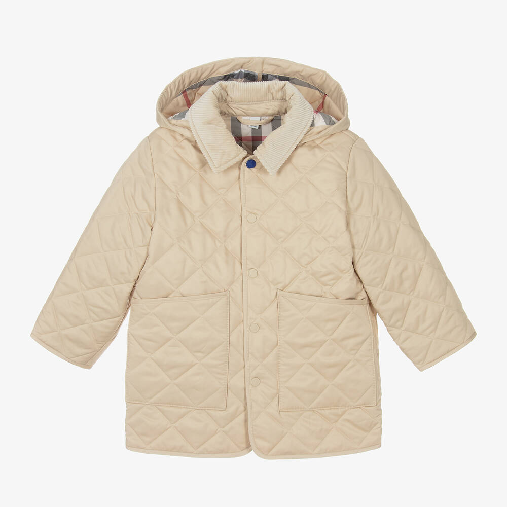 Beige quilted coat for boys by luxury British brand Burberry. Lightly padded, this hooded coat has a smart corduroy collar and a smooth lining, patterned in the iconic Burberry pale stone check design. It has deep, patch pockets and popper fastenings on the front, with a blue EKD popper on the neckline for an extra branded touch. Internal toggles, adjust the fit and shape of the coat. The main material of this product is made with at least 50% recycled content.