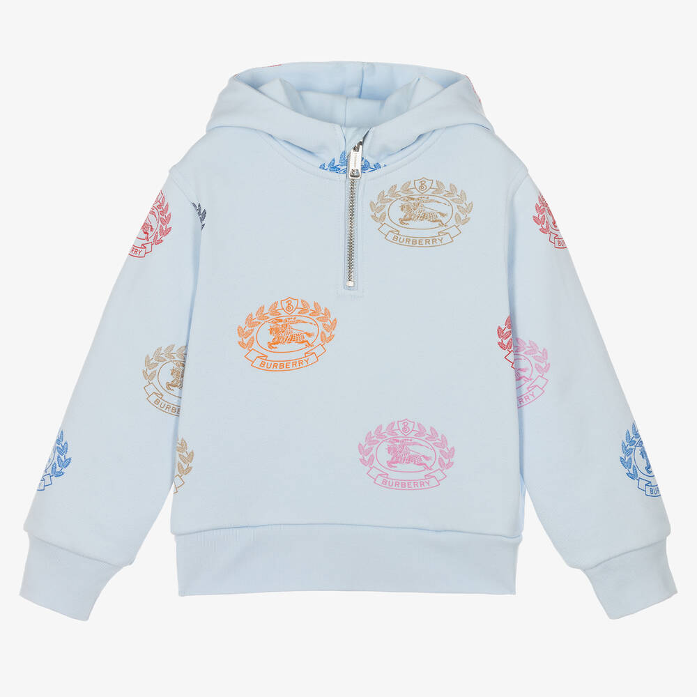 From luxury British brand Burberry, blue cotton jersey hoodie for boys. It has the brand's Equestrian Knight Design printed in different colours for a designer touch. For comfort the trims are ribbed and there is a branded half-zip fastening to make dressing easier. This product contains organic cotton.