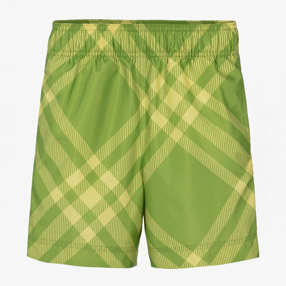 In a lovely shade of green, these swim shorts for boys by luxury British brand Burberry have a yellow check pattern. Smooth with a lightweight mesh lining, they have discreet pockets hidden in the side seams and a velcro-fastened patch pocket on the reverse. The elasticated waistband ensures a comfortable fit.