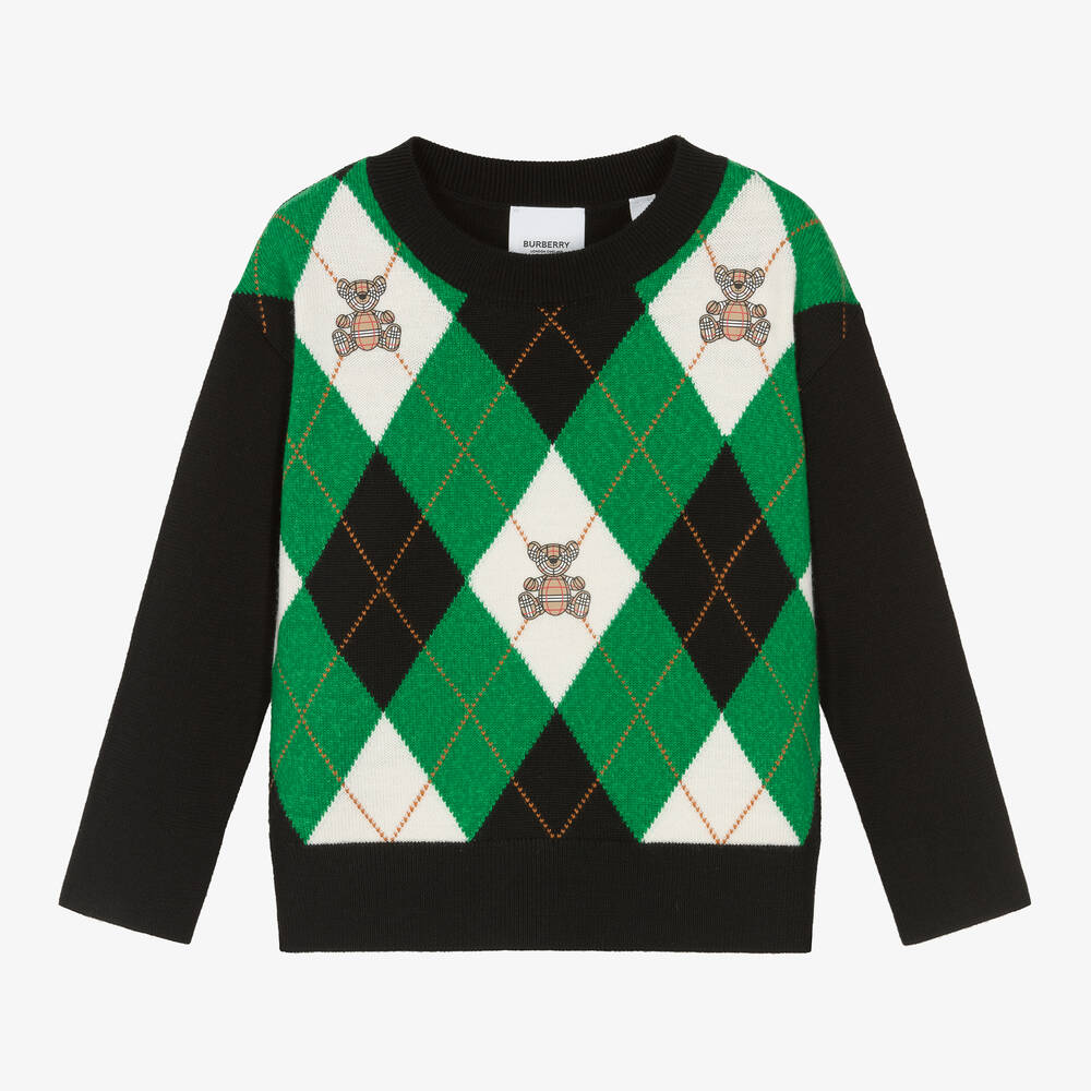 Black and green sweater for boys by British designer Burberry, in a luxuriously soft Merino wool knit. It features a green and white argyle patterned panel on the front knitted in a beautifully soft Merino wool and cashmere blend, along with the brand's iconic Thomas Bear motifs. Casual and comfortable it has a ribbed crew neck and hem for a cosy feel on cooler days. This top is made with responsibly sourced wool.