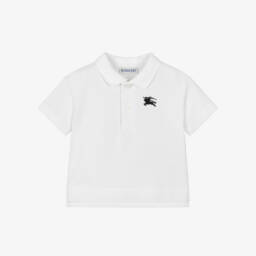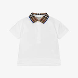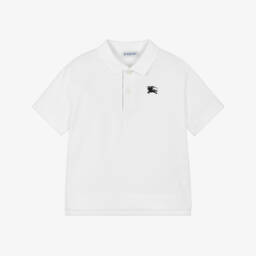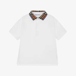 Inspired by the adult collection, this white Mini-me polo shirt for boys is designed by British luxury brand, Burberry. The iconic EKD can be seen stamped near the hem, with a Burberry Check background for instant label appeal. Simple buttons fasten the piece with classic polo styling in mind.