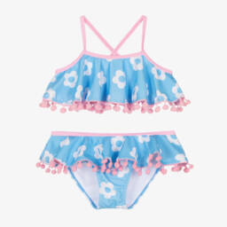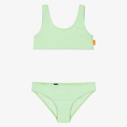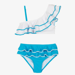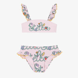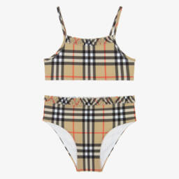 Beige bikini for girls by luxury brand Burberry, in the designer's signature Burberry Check. Made from recycled material, it is silky smooth and fully lined, with elasticated trims for comfortable wear. The top has an asymmetrical ruffle trim, with a narrow shoulder strap on one side.