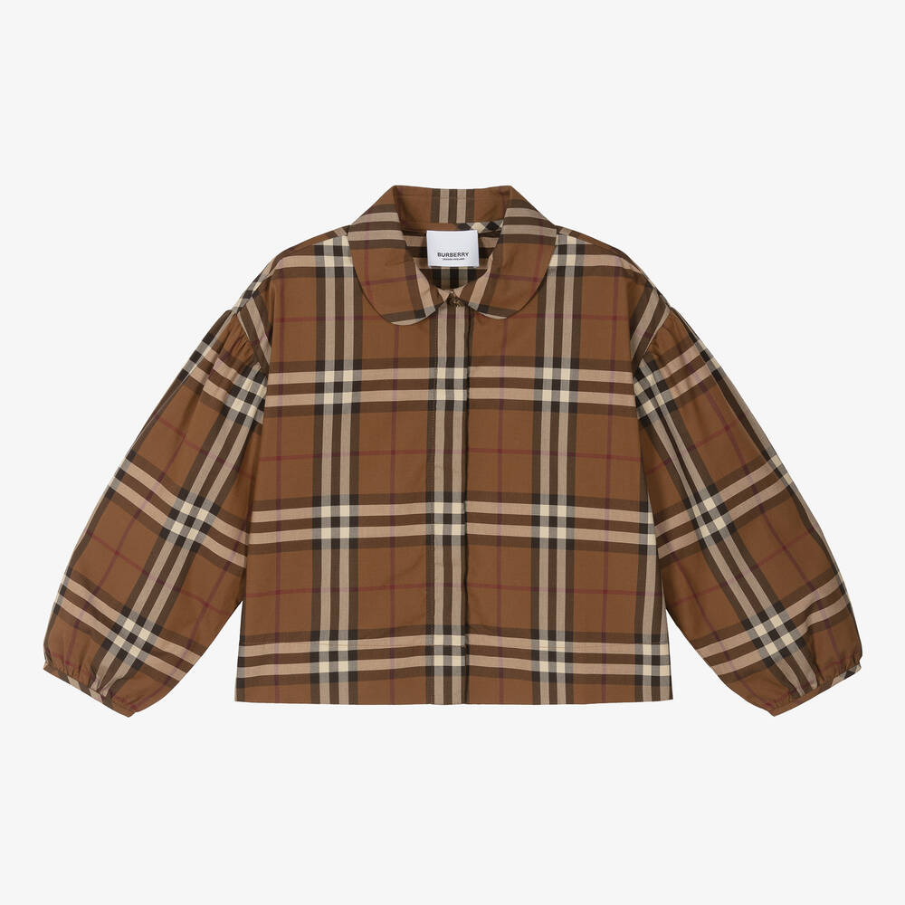 In a dark birch brown, this blouse for girls from luxury British brand Burberry is made in a soft cotton poplin. Patterned in the iconic Vintage check, it is styled in a relaxed boxy fit, with dropped shoulders and voluminous balloon sleeves. A rounded collar and concealed button fastenings on the front, complete the stylish look.