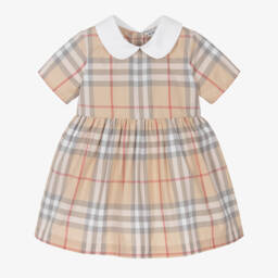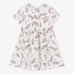 Blossom pink polo dress for girls by luxury label Burberry, made with organic cotton piqué. This short-sleeved dress has a ribbed collar and a two-button placket with a Burberry Check lining. It has an A-line shape and comes with a detachable fabric belt to tie neatly around the waist. The brand's signature Equestrian Knight Design is embroidered on the chest in orange.