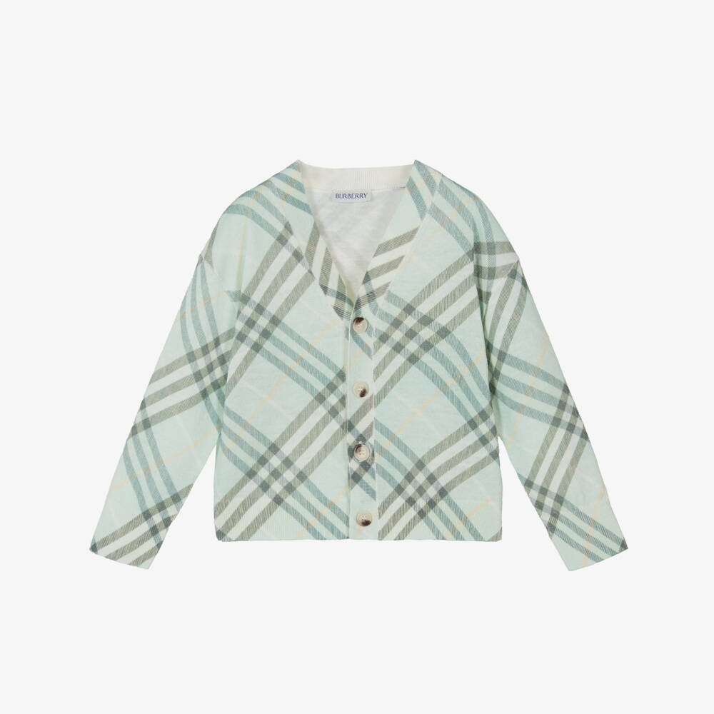 Pastel green V-neck cardigan for boys and girls by Burberry, patterned with the luxury British brand's Burberry Check. This stylish cardigan is knitted in a soft and lightweight linen blend for breathable comfort.