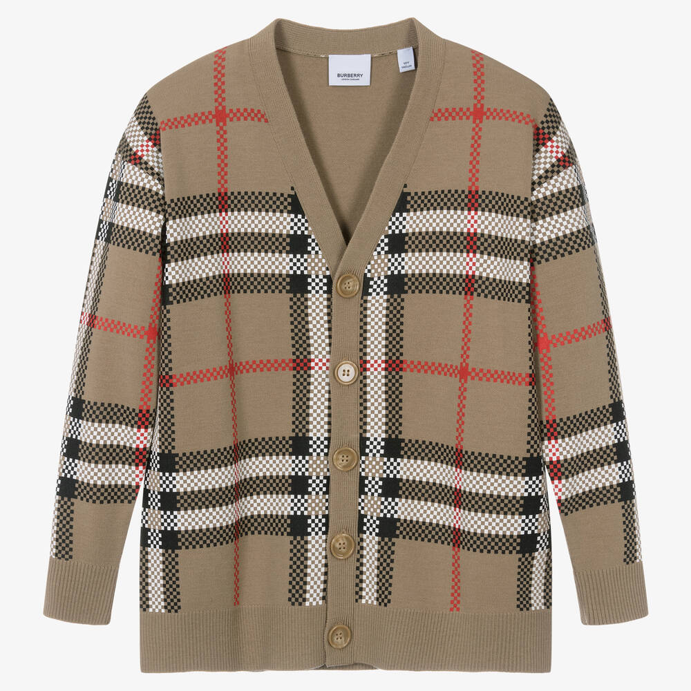 Teen Boys Beige Check Wool Cardigan