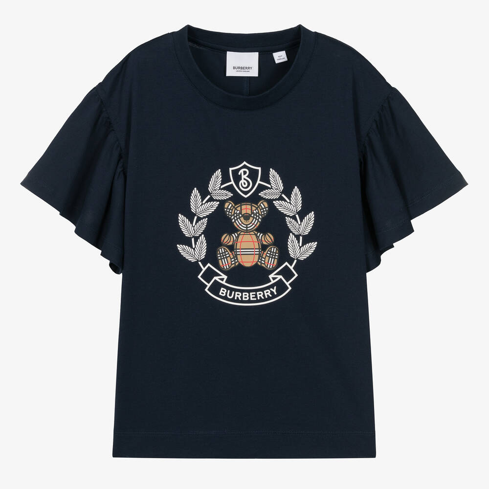 Deep charcoal blue T-shirt for teen girls by luxury designer Burberry. Distinctly designer, it has a varsity-inspired logo on the front featuring the brand's signature Thomas Bear, along with the Oak Leaf Crest. Made in soft cotton jersey, it is designed with stunning flutter sleeves for a stylish, modern look. This top contains organic cotton.
