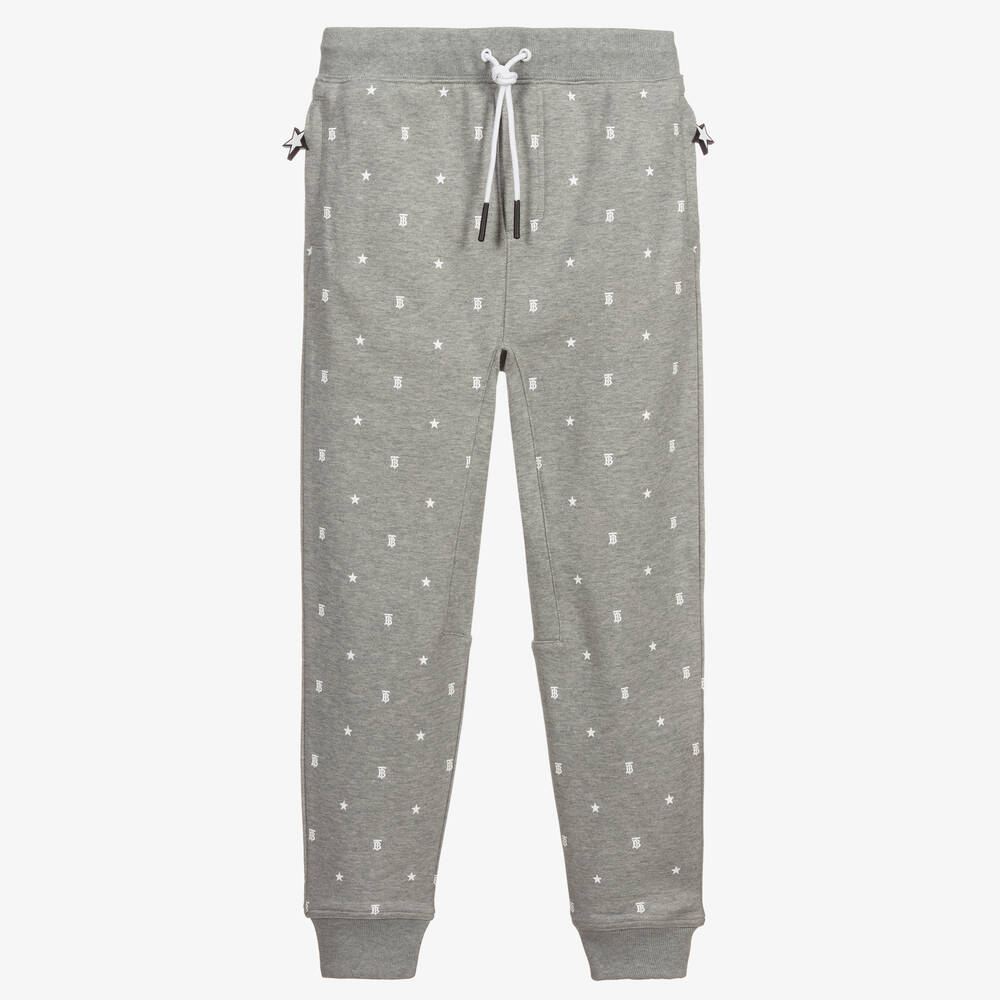 Teen boys grey jersey joggers by luxury brand Burberry, with a white TB monogram logo and star pattern. They have a drawstring waistband and zipped side pockets. One of Riccardo Tisci’s signature emblems, a five-pointed star adds playful punctuation to the zip pulls.