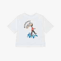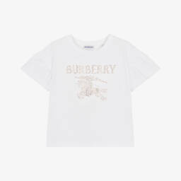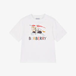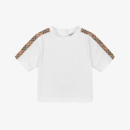A casual white cotton T-shirt for baby boys and girls by luxury brand Burberry. The front features a Burberry Check patch, embroidered with the designer's iconic Equestrian Knight Design. Shoulder poppers assist with over-the head dressing.