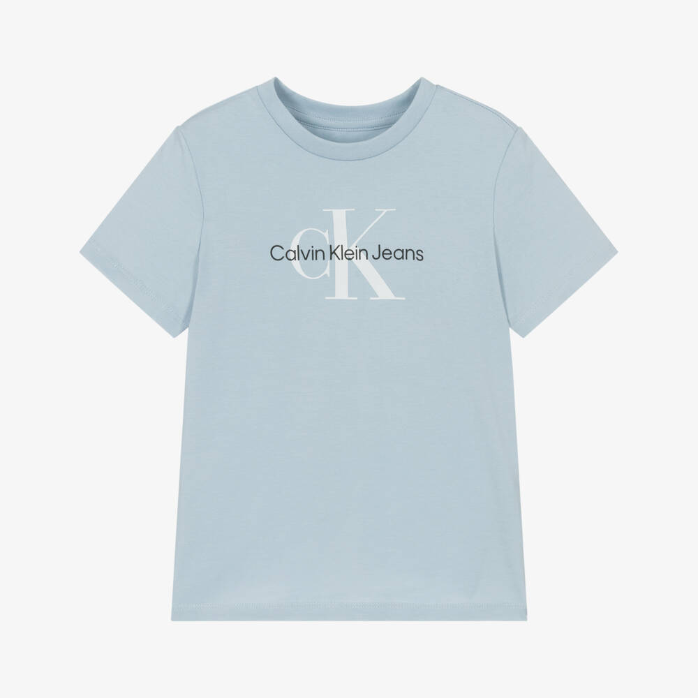 Pale blue cotton T-shirt for boys and girls by Calvin Klein, with a large white and black monogram logo on the front for a designer finish to this casual piece. It is made in soft, comfortable jersey.