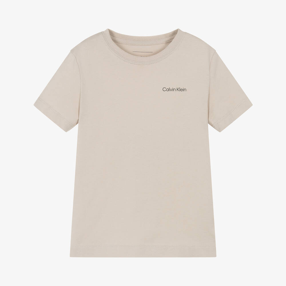 Boys beige T-shirt by Calvin Klein, made in soft cotton jersey. This wardrobe staple is stamped with iconic logo branding for a cool vibe.