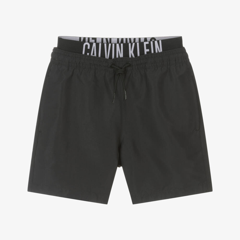 Black swim shorts for boys by Calvin Klein, for a cool beach or poolside look. Made in smooth, lightweight, quick drying fabric, they have useful side seam pockets and a drawstring waist. There is a further internal, elasticated waistband for a comfortable fit, with jacquard logos, and a mesh lining for comfort. The outer material of this product is made with at least 95% certified, recycled polyester.
