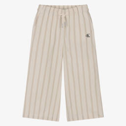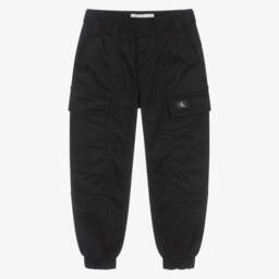 Blue-green cotton cargo trousers for boys by Calvin Klein. Cool and easy to wear, they have a pull-on style, with an elasticated waistband and cuffs. A large white and green monogram logo is embroidered on one cargo pocket, adding a designer touch to casual days. This product is made with at least 95% organic cotton.