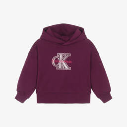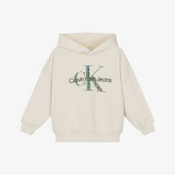 Ivory cropped hoodie for girls by Calvin Klein Jeans, with a grey logo printed on the front. It is made in stretchy jersey with a warm, fleecy inside and cosy, ribbed trims for all-day comfort.