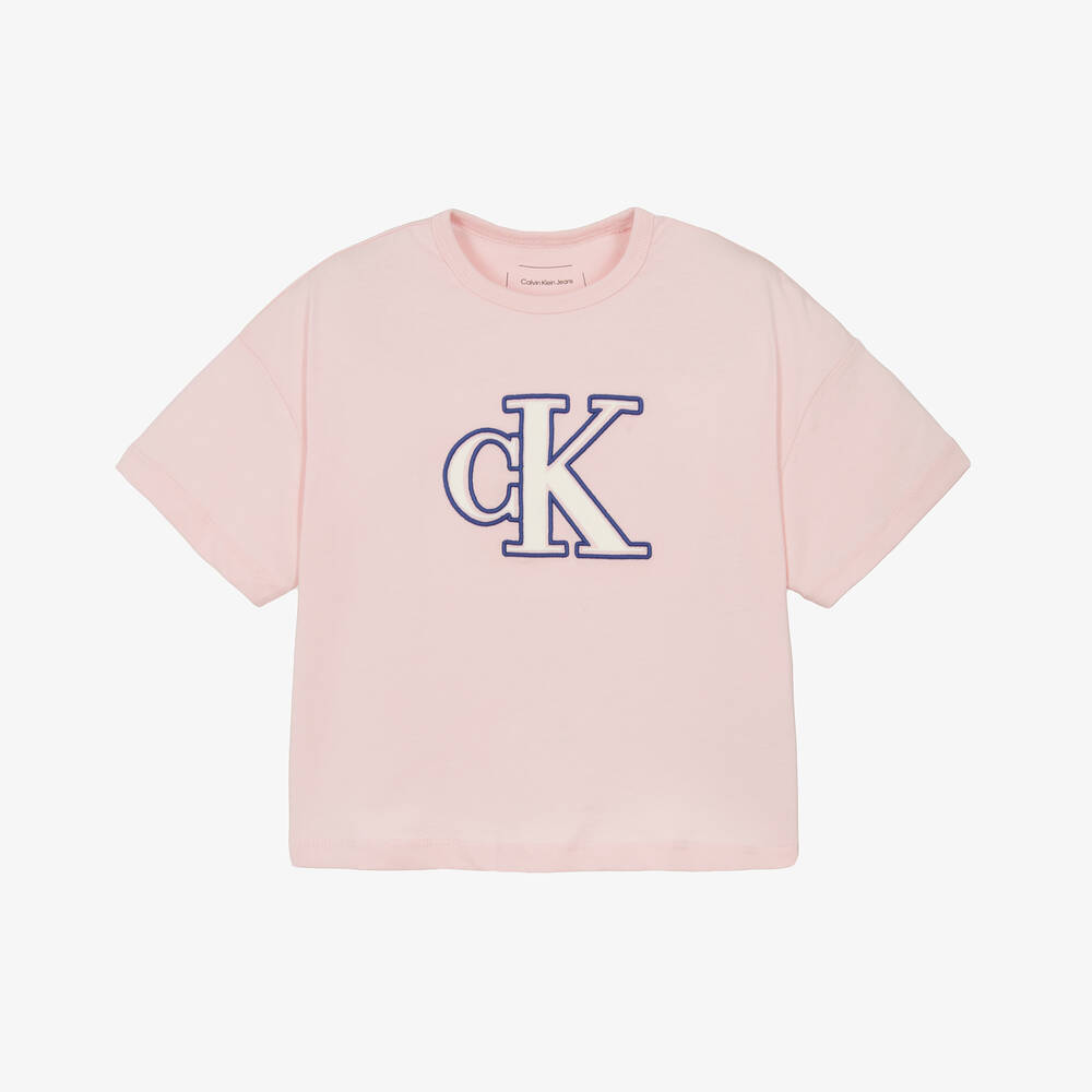 Pink T-shirt for girls by Calvin Klein, made in soft organic cotton jersey. A relaxed, boxy fit, this casual tee features a flocked and embroidered CK monogram logo in ivory and blue.