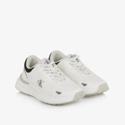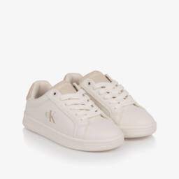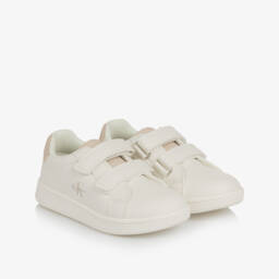 Sporty off-white trainers for girls by Calvin Klein, made in soft, glittery mesh with pale pink trims. Comfortable to wear, they have a lightly cushioned textile lining and insole, with a non-slip rubber outer sole providing good grip. The velcro strap features an embossed monogram logo for a subtle designer touch.