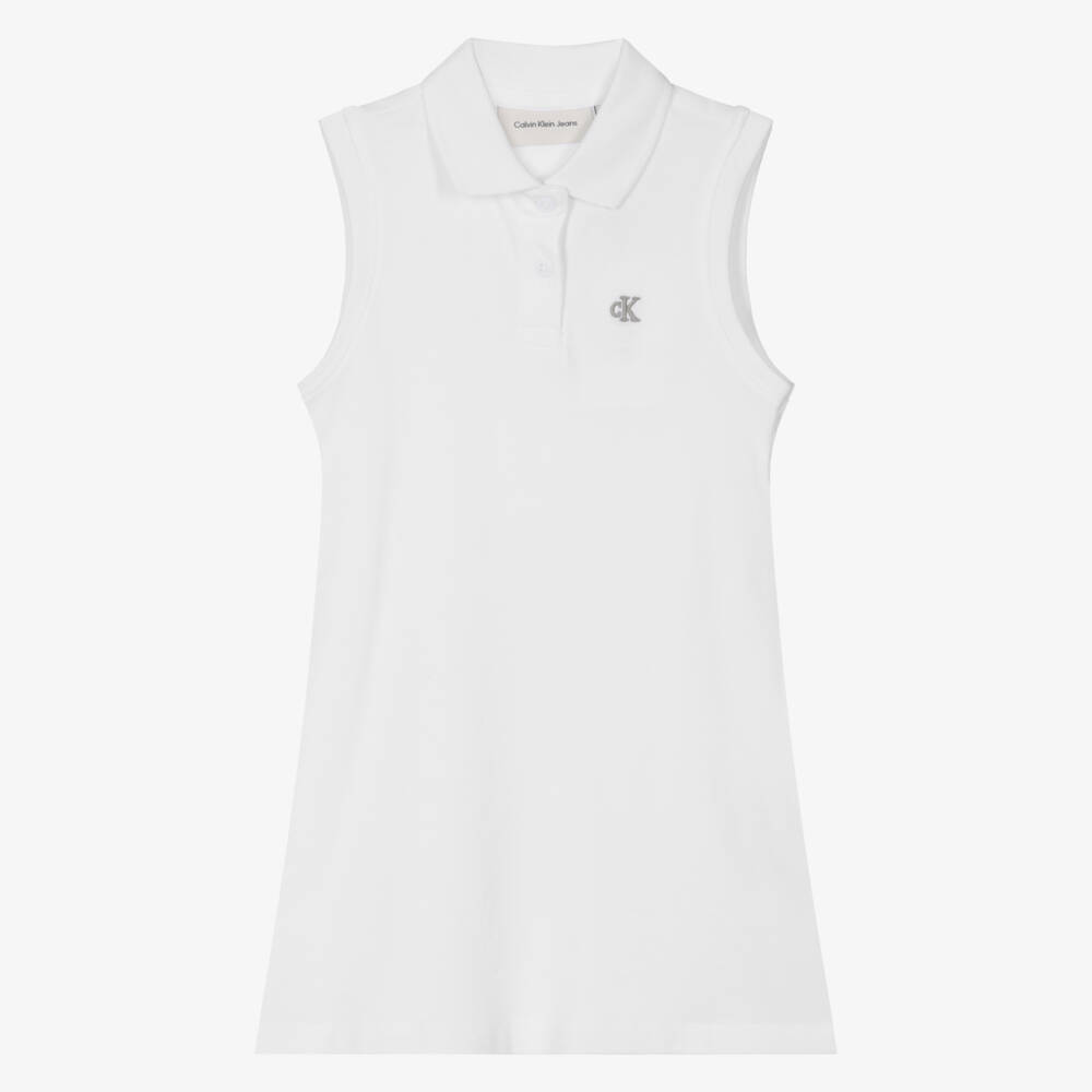 A white polo-style dress for girls by Calvin Klein, made in comfortable cotton piqué. This sporty style has a collared neckline and a buttoned placket. The Calvin Klein monogram is embroidered on the chest in soft grey for a branded finish.
