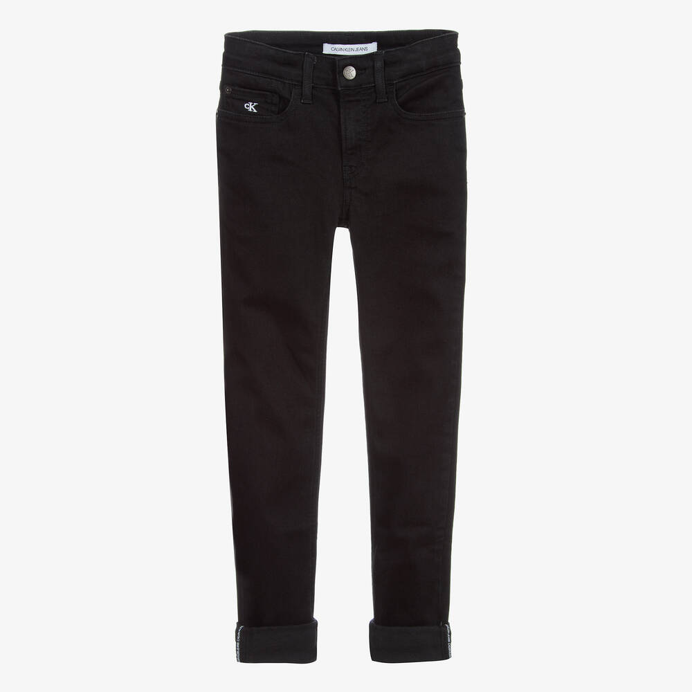 Teen boys black skinny jeans by Calvin Klein, made in eco-friendly, stretch cotton denim. There is a white embroidered logo on the coin pocket, a logo patch on the back and logo tape trims, that are revealed when the cuffs are rolled up. These skinny-leg jeans sit comfortably at the waist and are slim fit through the hip and thigh.