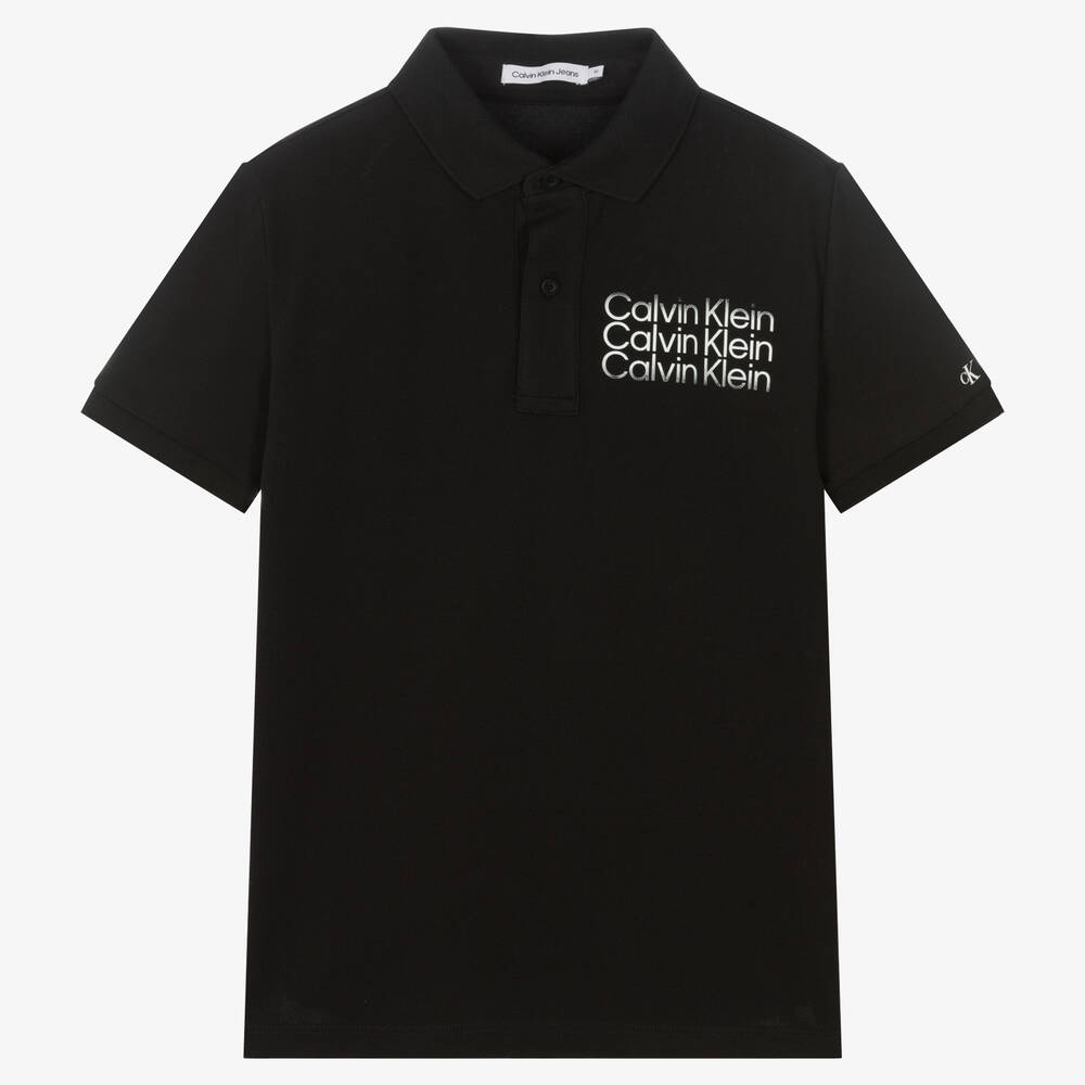 Classic polo shirt for teen boys by Calvin Klein Jeans, made in soft cotton piqué. It has a white triplicate logo print on the chest, with a CK monogram logo on one sleeve. There are branded button fastenings at the chest, and comfortable sides vents for ease of movement.