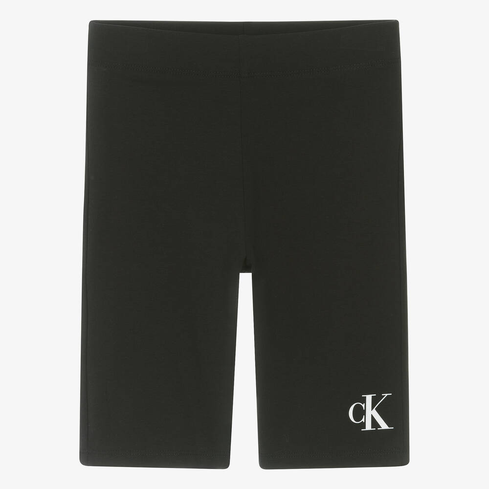 Teen girls black cycling shorts by American brand Calvin Klein, printed with a white monogram logo on one leg. Great for active days, these sporty shorts have a slim-fitting silhouette and an elasticated waistband. They are made from soft cotton jersey with added stretch for comfort.