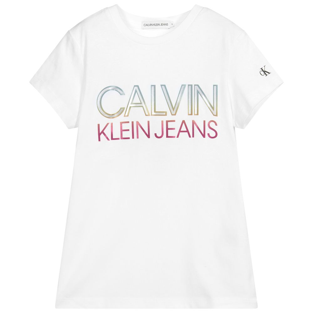 Girls white T-shirt by Calvin Klein Jeans, made in soft organic cotton jersey. It has a shiny silver, green and pink logo printed on the front.