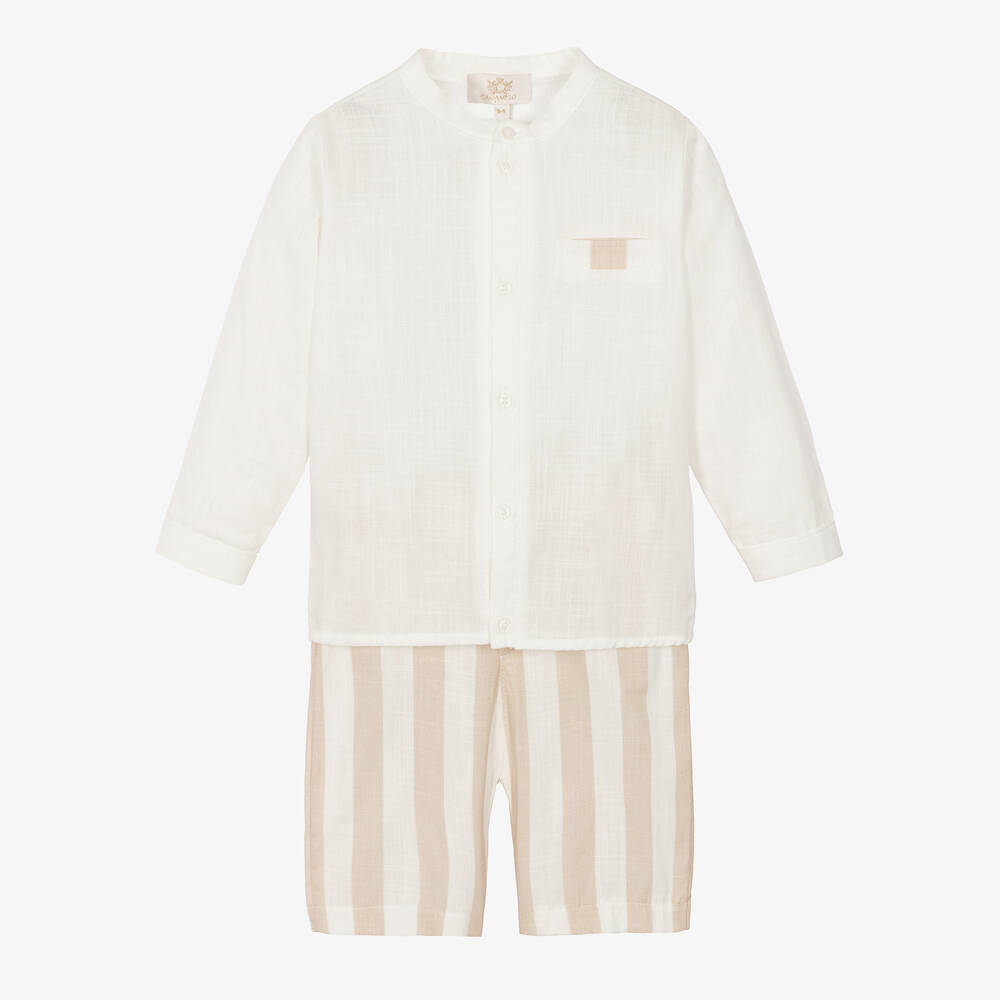 Smart casual in a classic styling, this ivory and beige shorts set for boys is by Caramelo Kids. Made in soft and lightweight cotton, both the shirt and shorts are cool and comfortable. The collarless shirt has a decorative pocket on the chest and fastens with buttons on the front and long-sleeved cuffs. The striped Bermuda shorts have a lightly elasticated back waistband and fasten with a front button and zip.