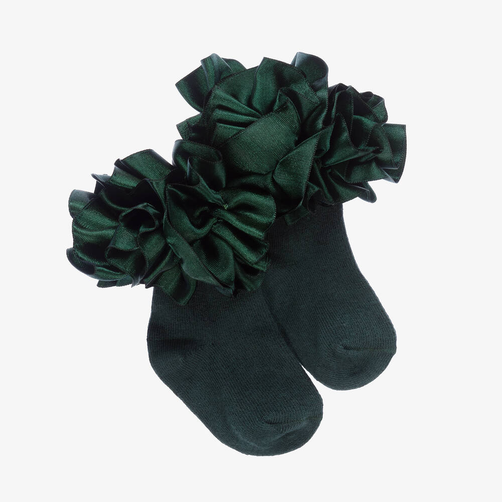 Younger girls dark green ankle socks by Caramelo Kids, made in a soft and stretchy cotton blend with a ruffled satin ribbon around the top.